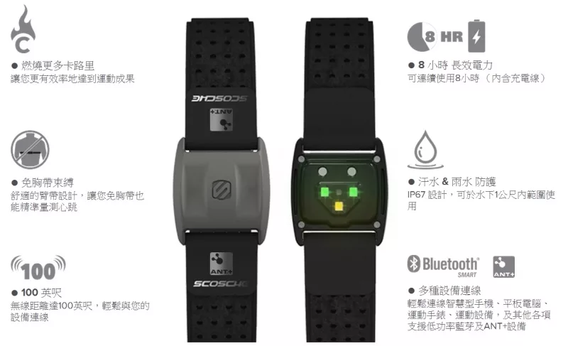 新一代產品功能再升級,包括:免胸帶設計、8小時長效電力、低功率藍芽與ANT+雙無線規格、IP67防水設計...等多項新產品特色。